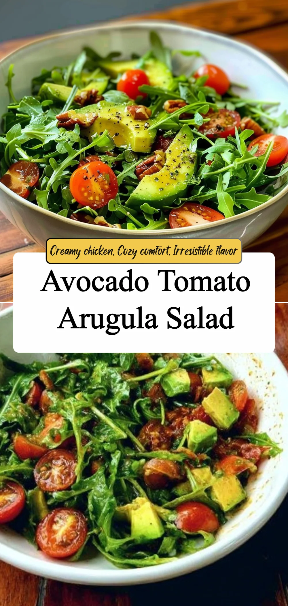 This salad is the kind of recipe that collects stories without trying to be perfect. It celebrates the seasonal sweetness of tomatoes, the peppery lift of arugula, and the buttery calm of avocado, and it lives at the intersection of quick weeknight needs and gentle weekend hospitality. Sharing simple food like this invites conversation and comfort, and it reminds us how little touches, like toasted pecans or a bright lemon squeeze, can turn ordinary ingredients into something memorable and warm.