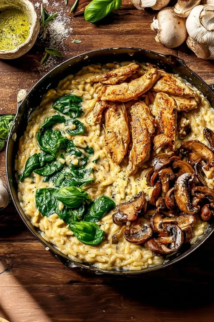 A heartwarming blend of tender chicken, bright veggies, and creamy orzo, perfect for cozy dinners.