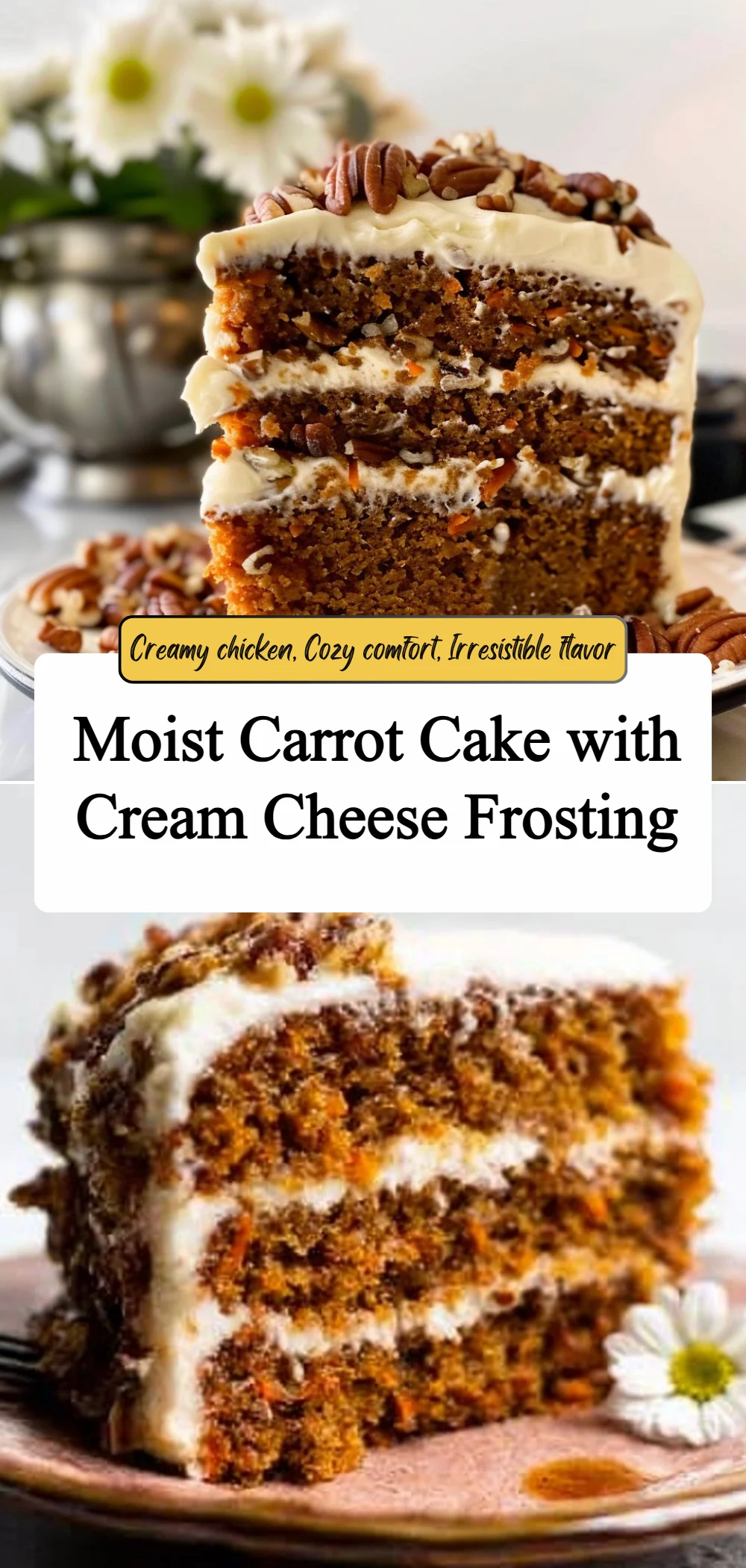 • Cozy atmosphere: Present on a wooden board or vintage cake stand with warm linens and soft lighting to enhance the comforting feel of this carrot cake.