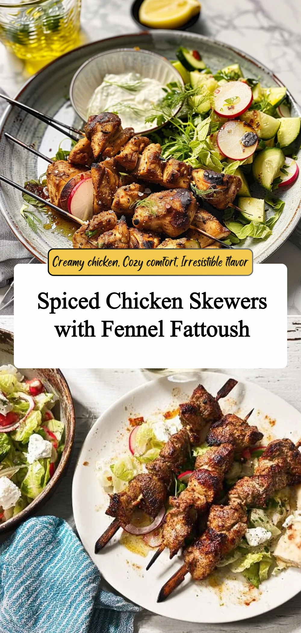 If you are seeking bold flavor with easy technique, this Spiced Chicken Skewers with Fennel Fattoush is built to impress without stress. Try it, share it, and pin it for a busy night when you want something both comforting and bright.